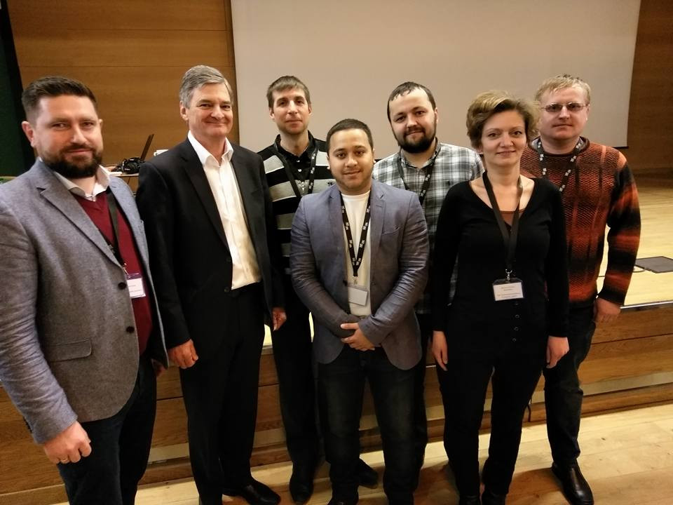 На фото зліва направо: Євген Полтенко, виконавчий директор Мережі, Кріс Бентлі, керуючий директор «Legal Innovation Zone» (LIZ) Університету Раєрсон (Торонто, Онтаріо), Сергій Мойсак, юрист ГО «Відкриті двері», Нафіз Ахмед, координатор з питань досвіду стартапів «Legal Innovation Zone», Ярослав Васютин , юрист Івано-Франківського офісу Мережі, Тетяна Матола, юрист БФ «Правозахисний фонд «Розвиток», та Сергій Кеба, президент ГО «Скадовщина-мій рідний край»