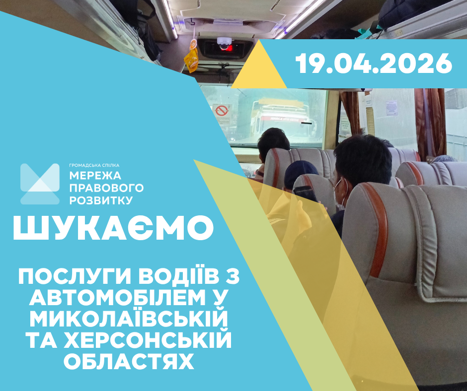 Громадська спілка “Мережа правового розвитку” оголошує відкритий тендер на закупівлю послуг водіїв з автомобілем в Миколаївській та Херсонській областях.