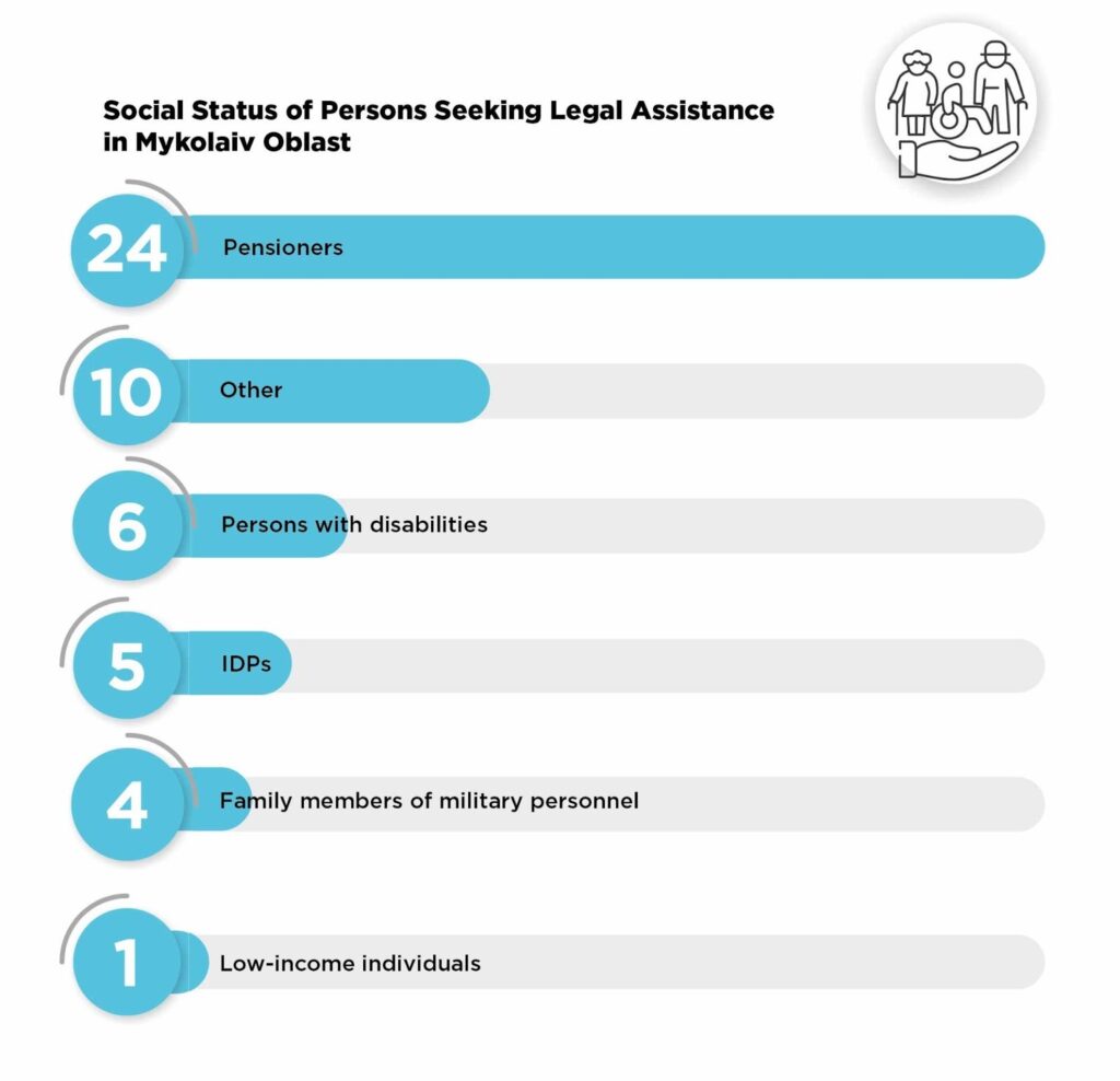 Regarding clients’ social status, the most requests are from pensioners—57 requests, from internally displaced persons—21 requests, four each from low-income individuals, family members of military personnel, and people with disabilities. Two requests—from people who returned home. “Other”—21 people. 53 clients did not identify their social status. The total number of social statuses is greater than 160, as combinations of categories occur. For example, IDP and person with disability, family member of military personnel and person with disability, etc.
