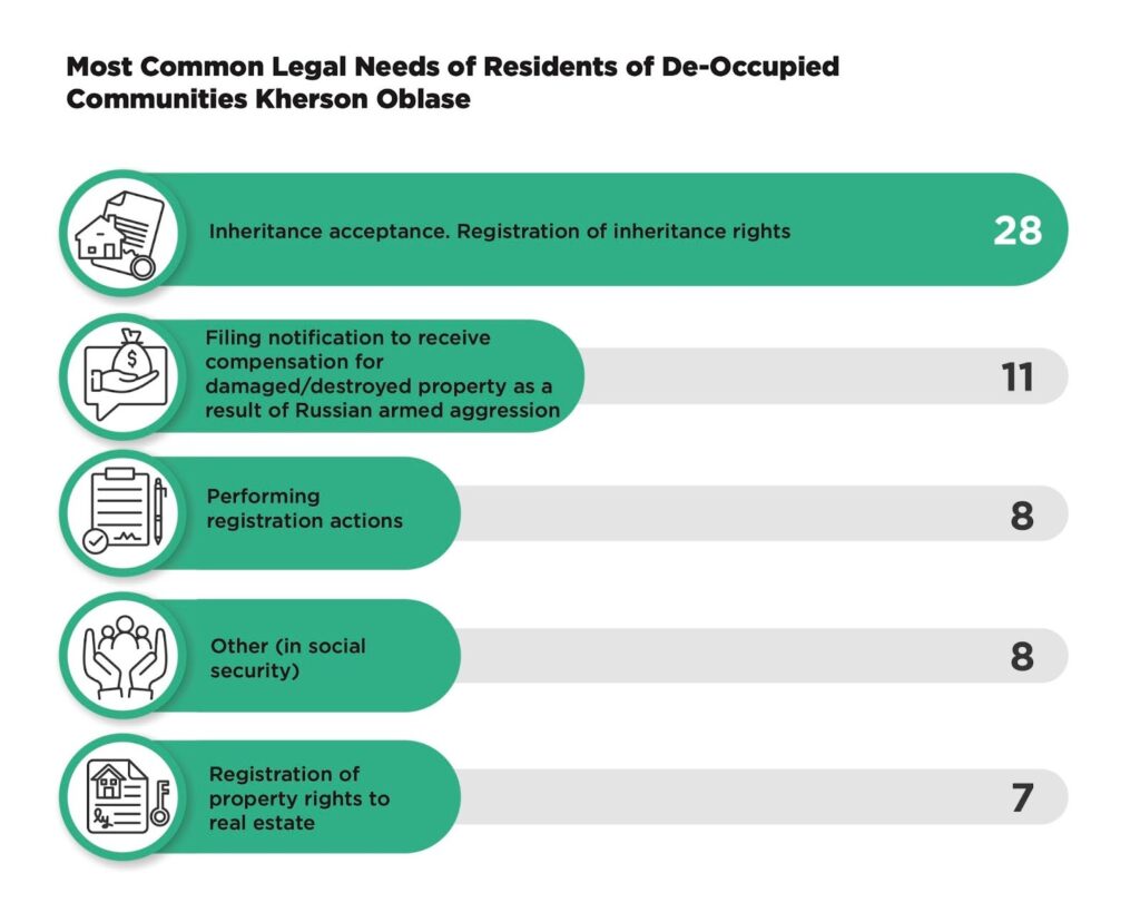In Kherson Oblast, the greatest number of needs were recorded in the area of civil law. Specifically, the procedure for documenting damage to receive compensation for damaged or destroyed property, registration of property rights to real estate, restoration of lost documents, and conclusion and termination of legal transactions. Many requests concern inheritance: its acceptance, inheritance of damaged property, drafting wills, and recognition of property rights to inherited property.