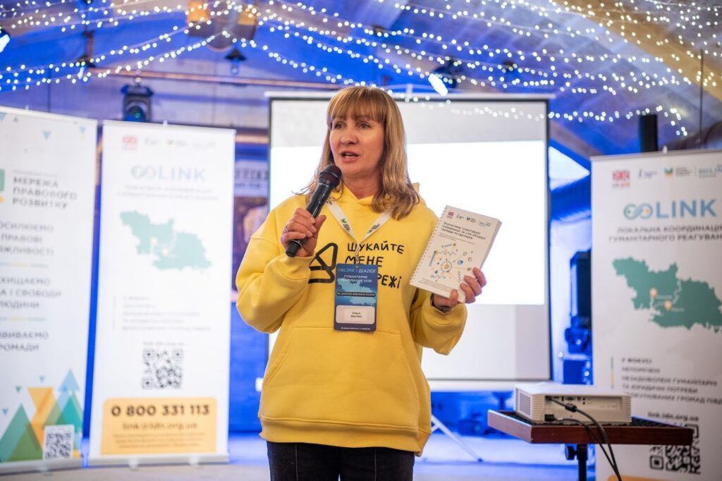 На фото: виконавча директорка Мережі правового розвитку Ольга Настіна демонструє посібник «Екосистема гуманітарної координації. Як Link об’єднує громади та партнерів»