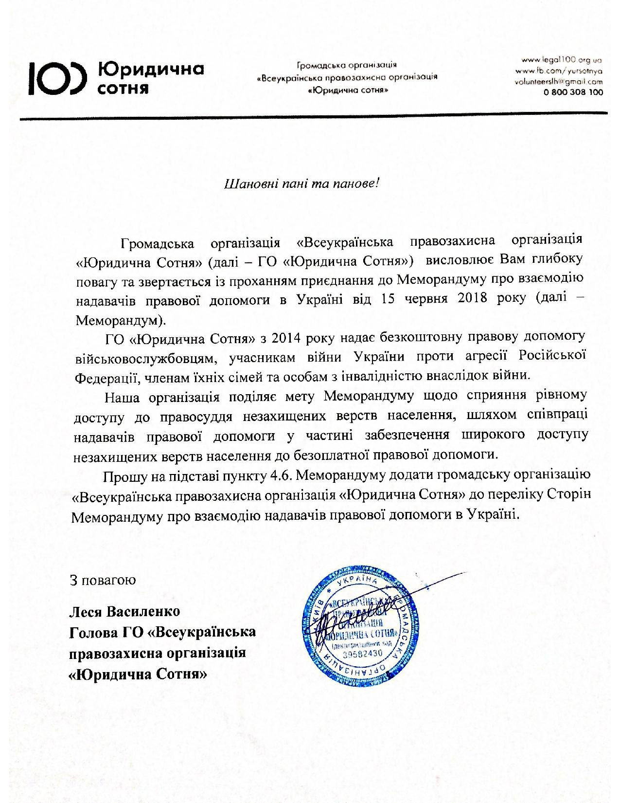 ГО «Всеукраїнська правозахисна організація «Юридична Сотня» заявила про своє бажання приєднатись до Меморандуму про взаємодію надавачів правової допомоги в України.