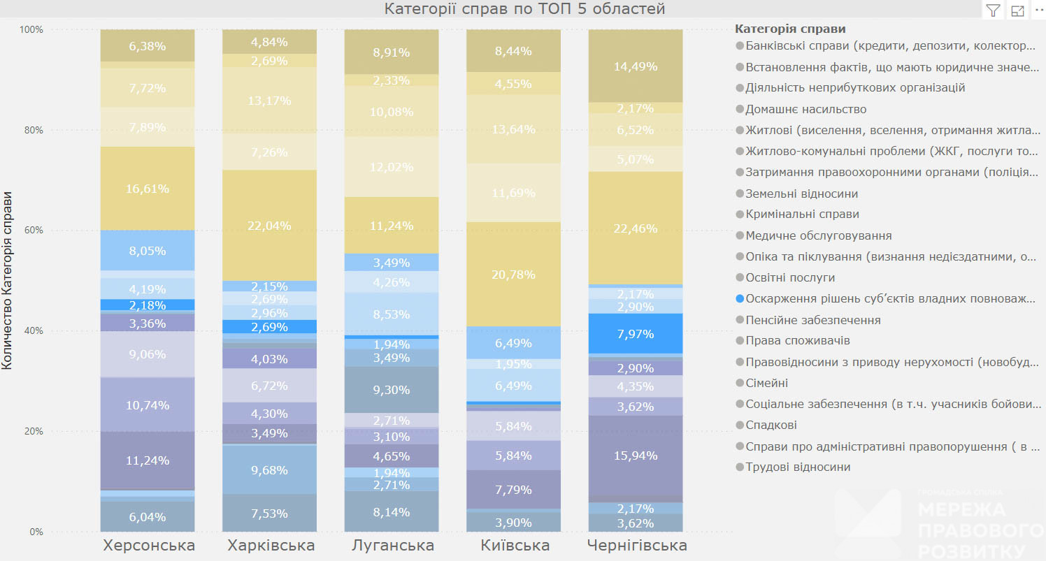 Цікаву інформацію може надати аналіз справ по конкретних областях. Ми обрали ТОП 5 областей за кількістю звернень та проаналізували категорії справ, з якими звертаються клієнти. ( Інформація найбільш достовірна для таких населених пунктів: Херсонська область: смт. Білозерка, місто Херсон, місто Скадовськ. Харківська область: місто Чугуїв, смт Дворічна. Луганська область: місто Новоайдар, місто Сєвєродонецьк. Київська область: місто Біла-церква. Чернігівська область: місто Чернігів.)