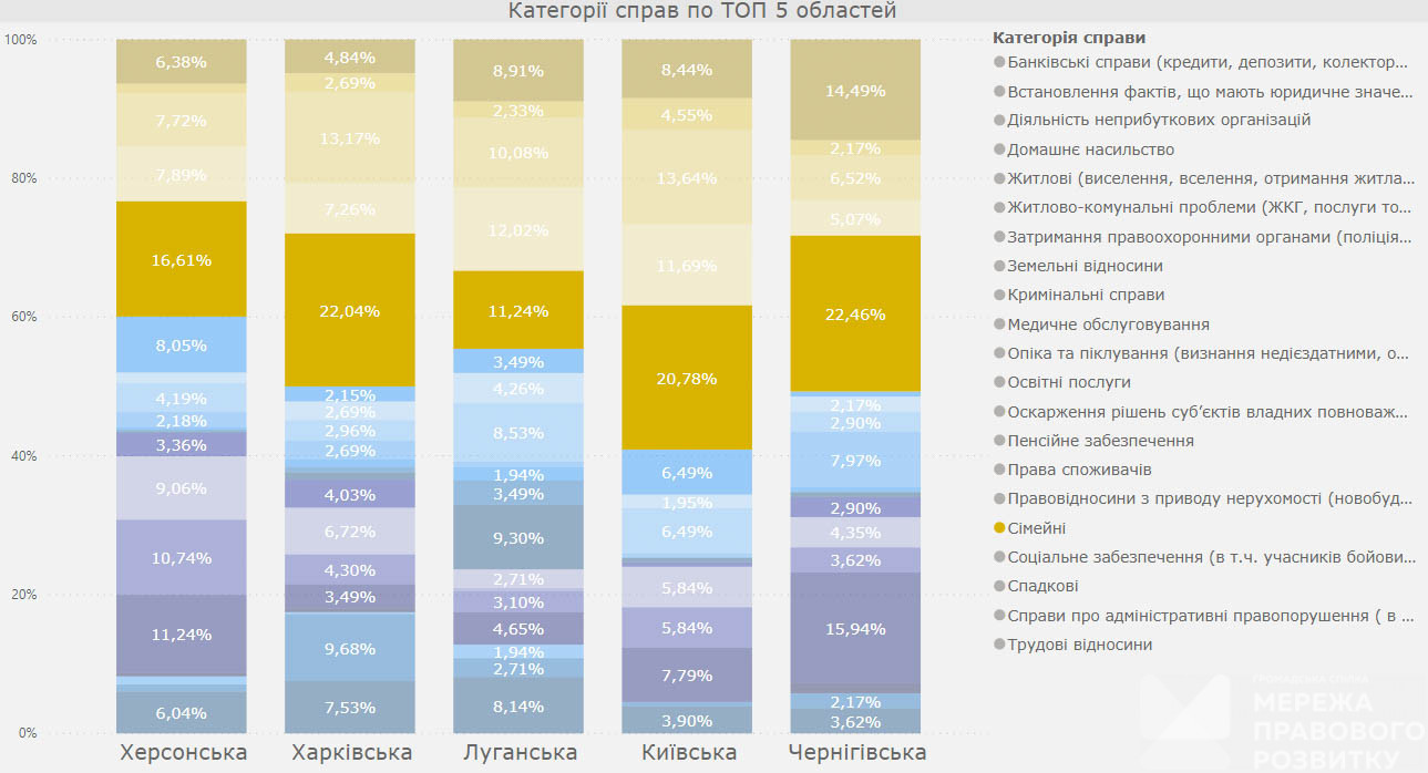 На графіку можна прослідкувати, що сімейні справи є найбільшою категорією за кількістю звернень. Вона займає від 11,24% у Луганській області до 22,46% у Чернігівській.