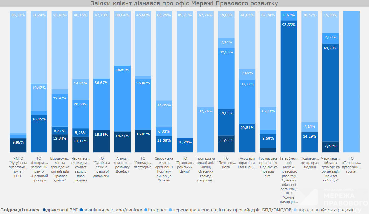 На цих трьох графіках можна прослідкувати, що найбільша кількість клієнтів дізналась про послуги офісів Мережі правового розвитку через пораду знайомих та друзів. Ця тенденція спостерігається для всіх офісів та вікових груп, а також каналів консультації (в офісі або онлайн). Також частина клієнтів дізналась про послуги за допомогою мережі Інтернет. Це більшою мірою характерно для клієнтів, які отримали консультацію онлайн. За віковим розподілом це характерно для клієнтів віком від 20 до 42 років. Інтернет як канал залучення клієнтів більше використовується громадськими організаціями: “Правова єдність” (м. Біла Церква) – 22,97%, “Чернігівський громадський комітет захисту прав людини” (м. Чернігів) – 20%, “Суспільна служба правової допомоги” (м. Новоайдар) – 36,67%, “Агенція демократичного розвитку Донбасу” (м. Слов’янськ) – 46,59%, “Громадська платформа” (м. Сєвєродонецьк) – 35,8%, “Перспектива Нова” (м. Кам’янка бузька) – 42,86%, “Асоціація юристів Кам’янця-Подільського” (м. Кам’янець-Подільський) – 30,77%.