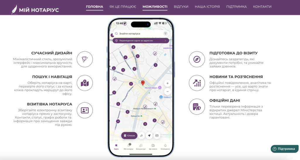 - Пошук нотаріуса на мапі, перевірені контакти, офіційні новини, первинні консультації та зручні сервіси, що постійно розширюються.