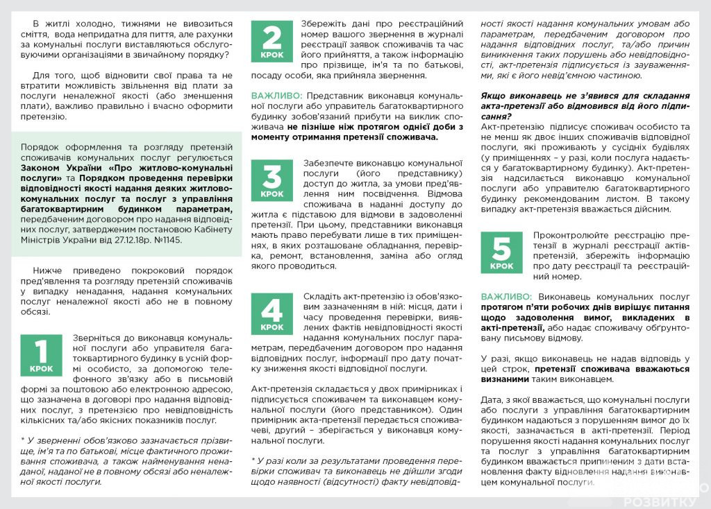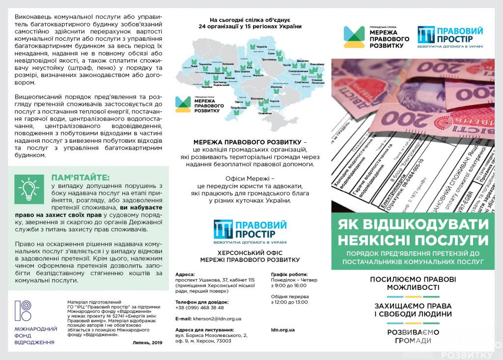 Буклет* із покроковим алгоритмом дій – від юристів Херсонського офісу Мережі правового розвитку при громадській організації ІРЦ Правовий простір. Якщо у вашій квартирі взимку холодно, тижнями не вивозиться сміття, вода непридатна для пиття, але рахунки за комунальні послуги обслуговуючі організації виставляють у звичайному порядку – складайте претензію. Вчасно і правильно оформлене звернення допоможе відновити ваші права та не втратити можливість звільнитися від плати за послуги неналежної якості або добитися її зменшення.